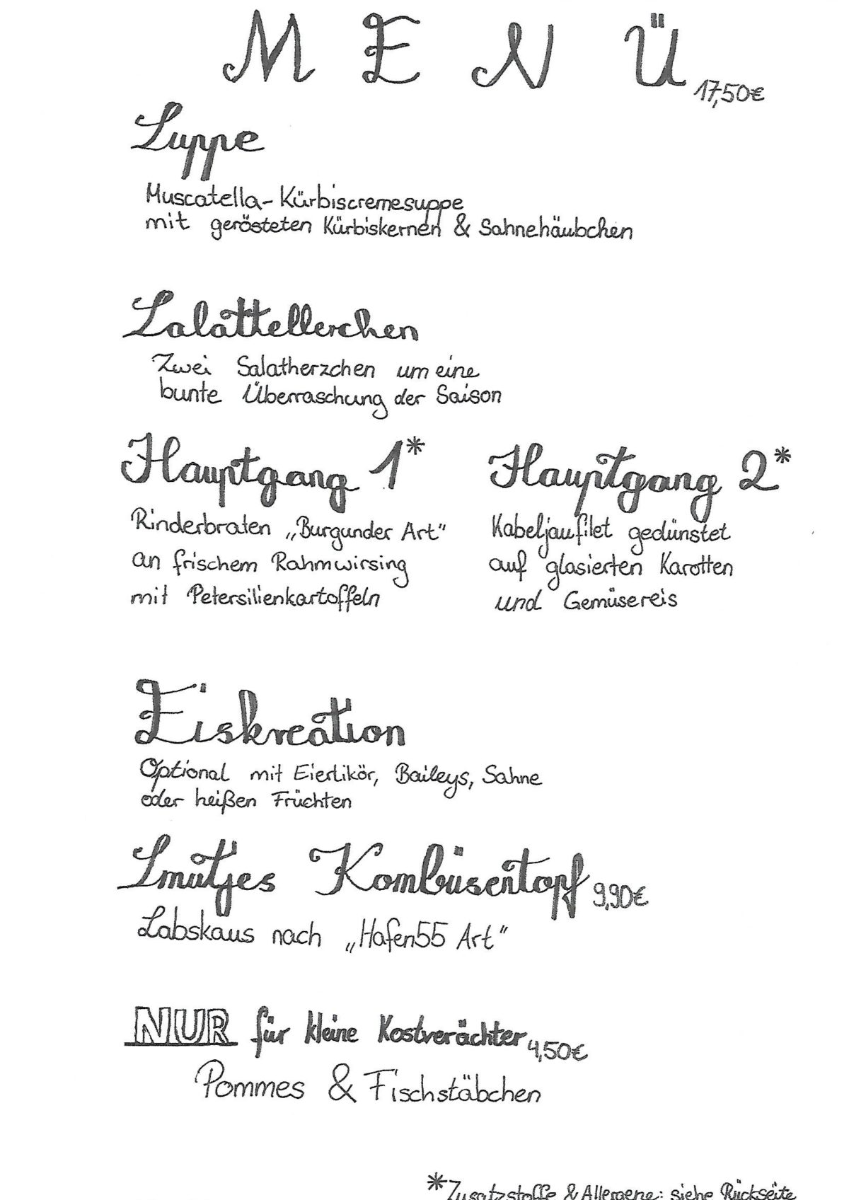 Alternativ auch noch „Smutjes Kombüseneintopf“ mit geröstetem Brot zu € 9,90.